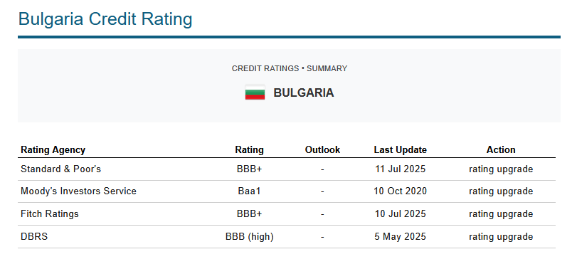 Gli attuali rating creditizi della Bulgaria, secondo le principali agenzie di rating, collocano il debito governativo nella fascia investment grade, cioè obbligazioni che riflettono un basso rischio di insolvenza.