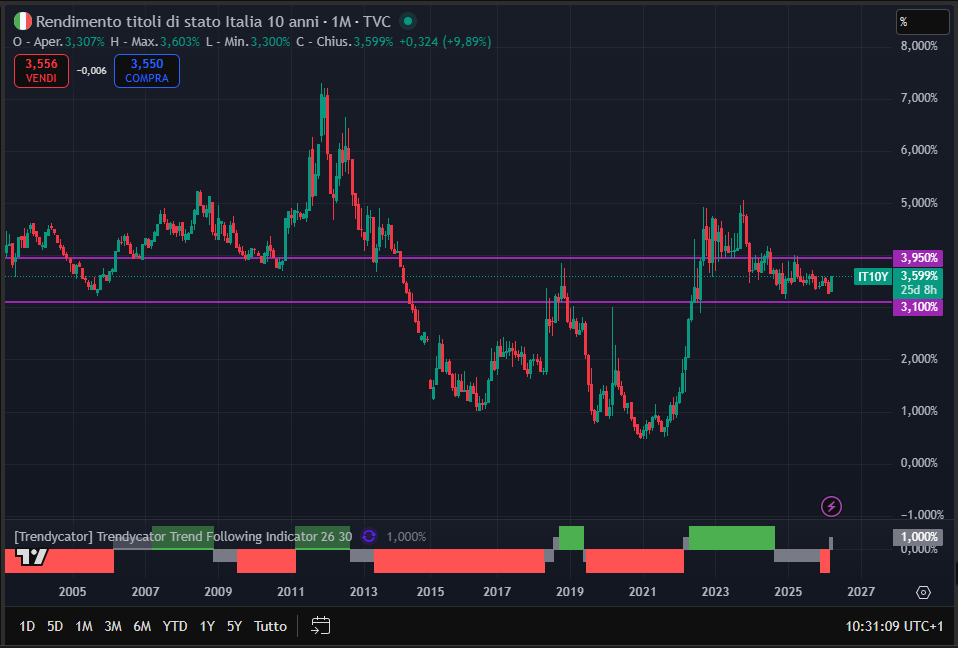 In altre parole, per arrivare alla durata piena di dieci anni e incassare tutte le cedole previste – pari complessivamente al 71% – il rendimento del BTP dovrebbe rimanere all’interno di un corridoio piuttosto preciso, compreso tra 3,10% e 3,95%.