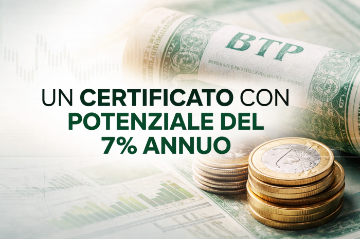 Questo Certificato Memory Cash Collect, emesso da BNP Paribas, ha come sottostante l’indice Solactive BTP 10Y. Paga cedole annuali del 7,1% con effetto memoria se il rendimento del BTP decennale resta sotto il 3,95%. Possibile rimborso anticipato dal 2027 se il rendimento scende sotto il 3,10%. Durata massima 10 anni con rimborso del 100% del capitale a scadenza.