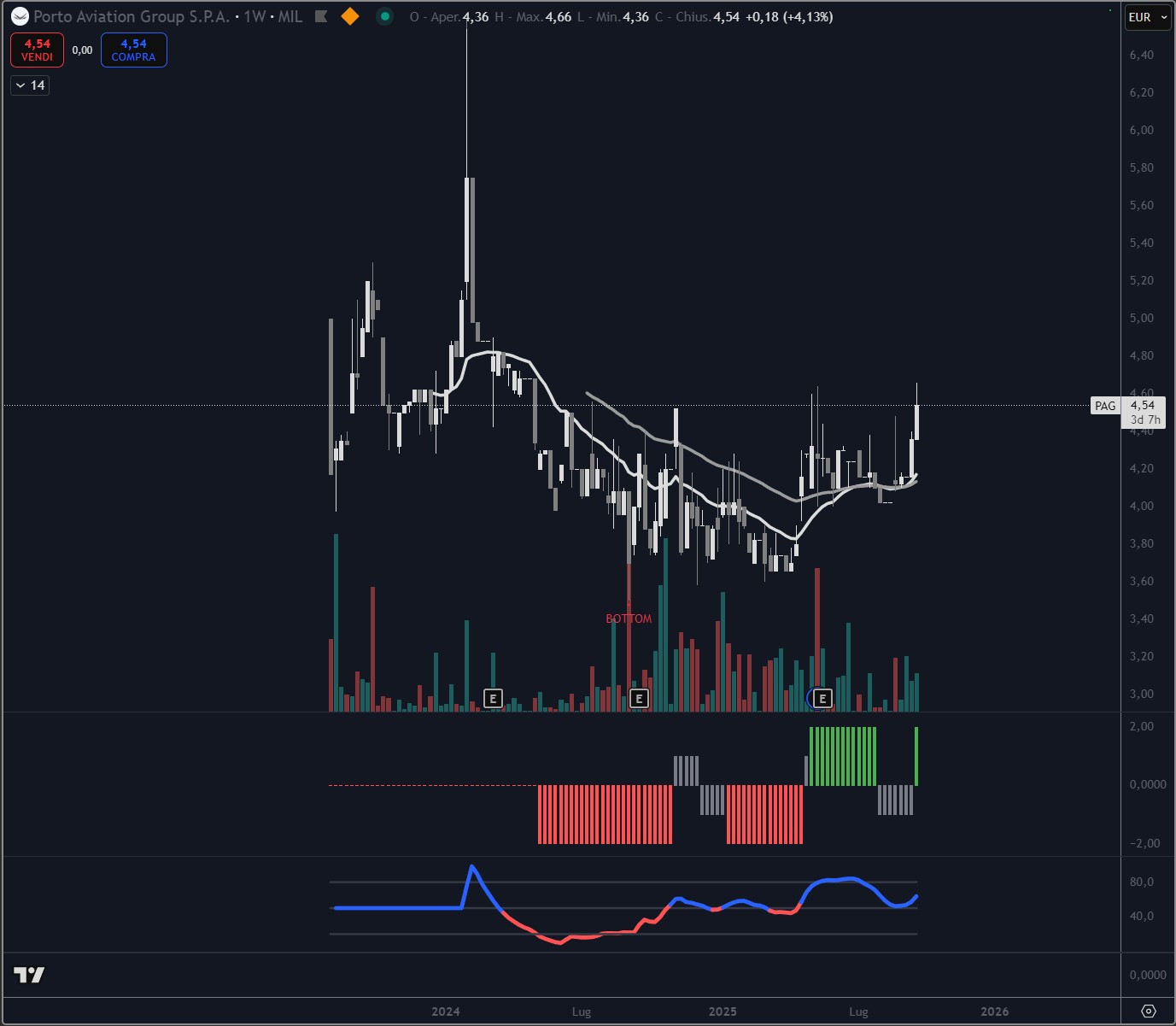 Dal punto di vista grafico, Porto Aviation Group mostra una fase di base costruita tra i 4 e i 4,5 euro, con volumi estremamente ridotti che riflettono la natura sottile e speculativa del titolo. Le ultime sedute hanno evidenziato un tentativo di ripartenza, con prezzi in risalita sopra le medie di breve periodo.
