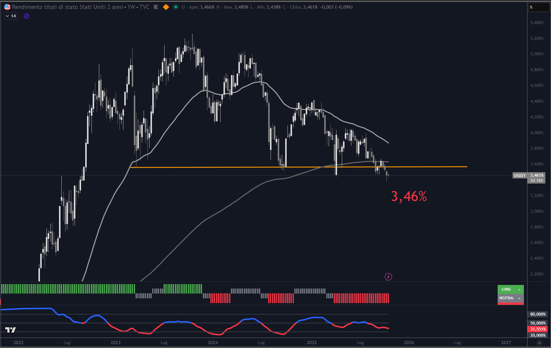Quando i rendimenti dei bond USA a 2 anni scendono bruscamente, il mercato azionario tende a seguirli. E oggi, per la prima volta dopo anni, sono tornati sotto il 4%.
