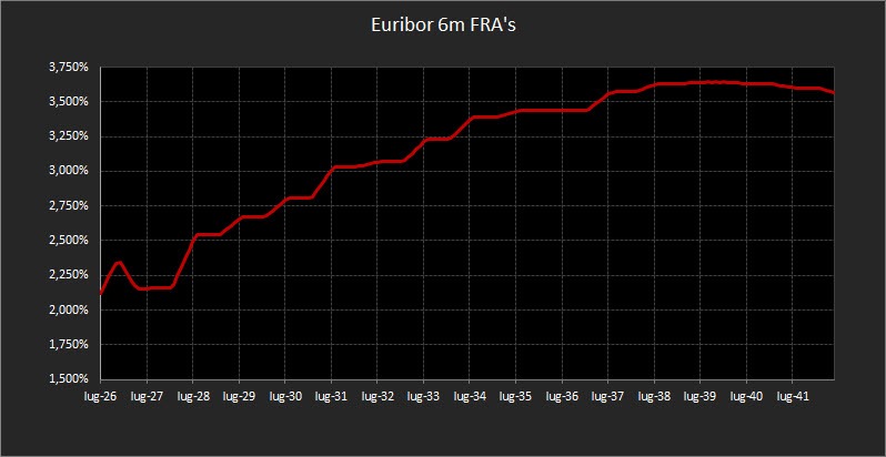 Sul fronte monetario, i Forward sull’Euribor a 6 mesi risultano sostanzialmente stabili. Nel tratto 2026–2028 i rendimenti oscillano tra il 2,10% e il 2,25%, con un baricentro in area 2,15%. Oltre tale orizzonte, il profilo torna gradualmente a salire, raggiungendo area 3,50% sulla scadenza decennale, in linea con la struttura forward che osserviamo da settimane.