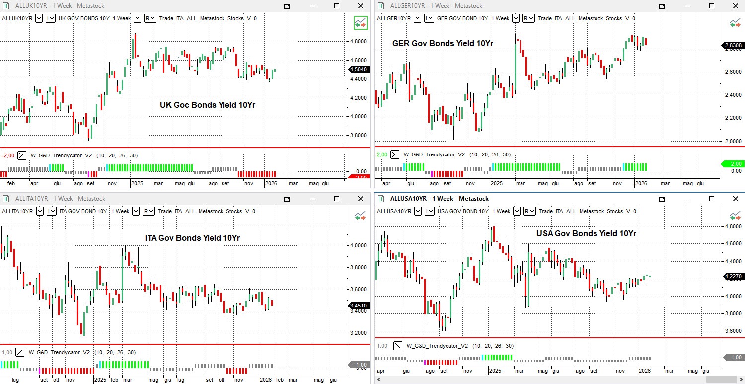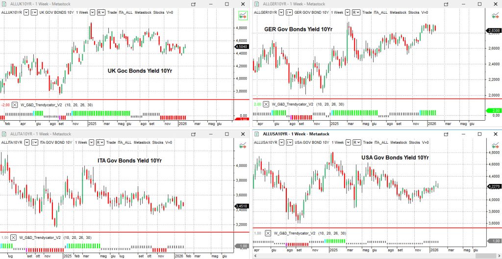 Nel Regno Unito, il rendimento del Gilt decennale sale al 4,50%. Il movimento conferma la fase di recupero osservata nelle ultime settimane, ma il Trendycator rimane posizionato SHORT sui rendimenti. Questo assetto suggerisce che il rialzo in atto si inserisce ancora all’interno di una dinamica correttiva non conclusa, con una struttura che resta vulnerabile, in particolare sulle scadenze intermedie, e priva di un segnale di stabilizzazione convincente.
