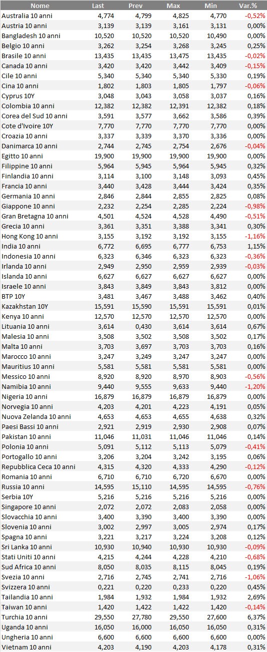 Rendimenti bond governativi benchmark mondiali