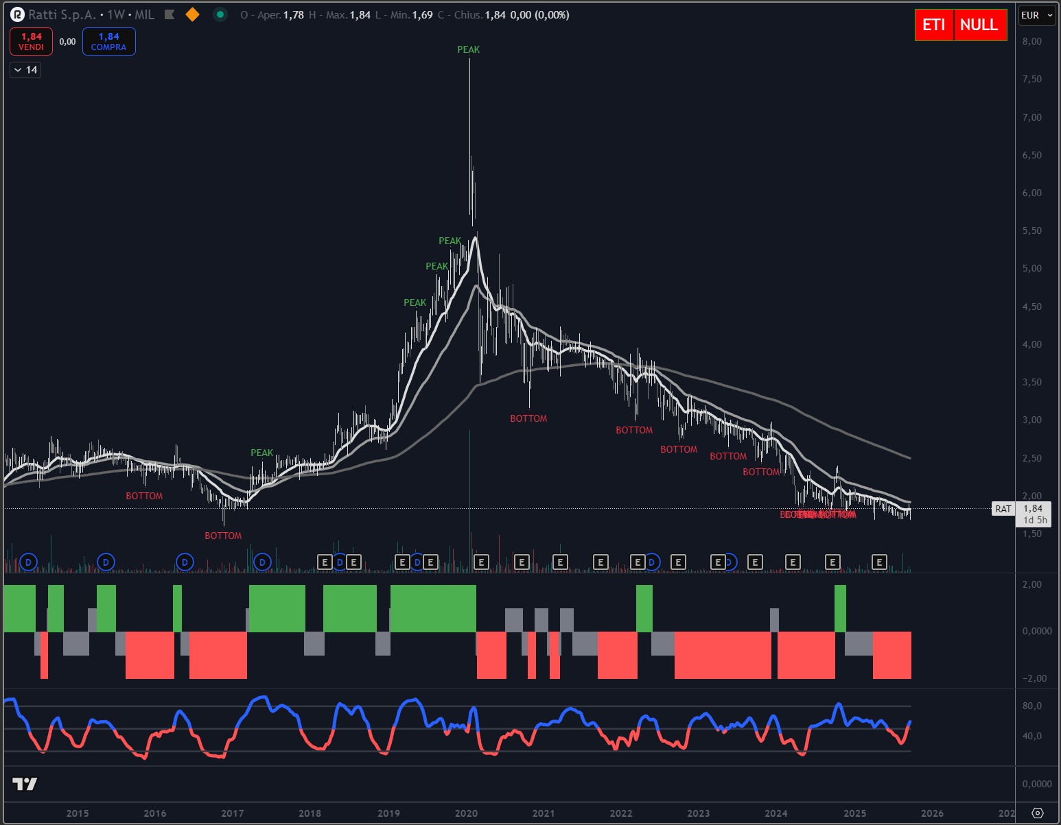 Il grafico di Ratti S.p.A. evidenzia un lungo trend ribassista, iniziato dopo i massimi storici del 2018, che ha riportato le quotazioni sui minimi in area 1,80 euro. Negli ultimi mesi il titolo sta cercando una base di stabilizzazione, ma le medie mobili restano inclinate al ribasso e confermano la debolezza strutturale.
