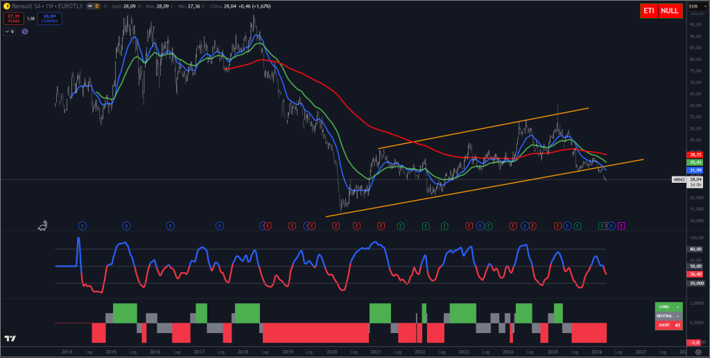 A questo punto il grafico settimanale diventa particolarmente interessante. Dopo il minimo del 2020, Renault ha costruito un canale ascendente con minimi e massimi progressivamente crescenti. Nelle ultime settimane quel canale è stato violato al ribasso.