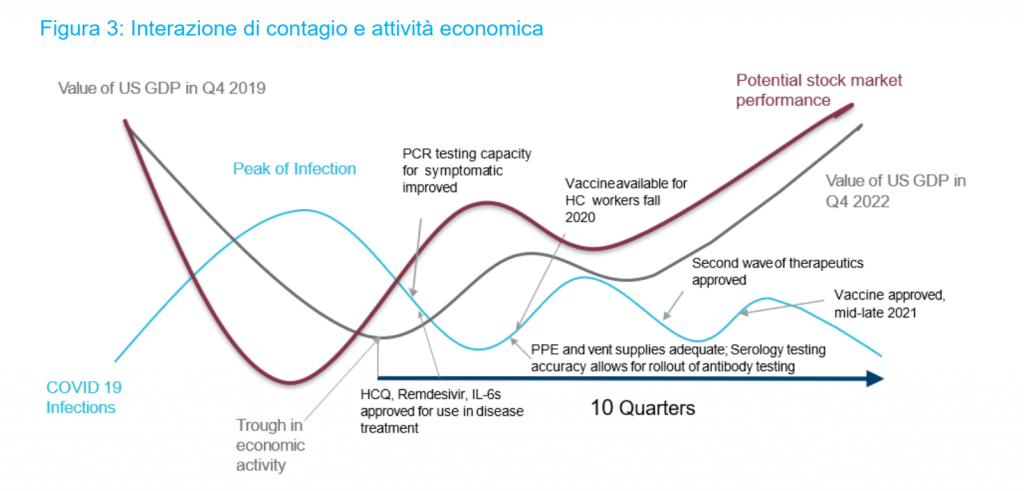 Osservando il grafico si vede la linea rossa che rappresenta le borse ripartire molto prima della discesa della curva pandemica in blu. Anche se per un vaccino ci vorranno, secondo questa stima, 10 trimestri e la curva dei contagi avrà alti e bassi non inciderà più sulla crescita economica semplicemente perché ormai si è adattata alla presenza del virus.