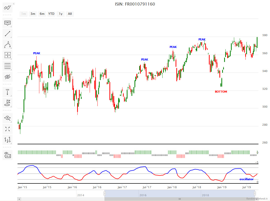 La conformazione grafica dell’ETF Amundi Ftse Epra Eur Real Est LU1681039480, come dicevamo, è decisamente interessante, poiché Trendycator ci segnala un potenziale buy nascente. Come si vede dal grafico, la settimana appena conclusa ha registrato una bella barra rialzista che ha riportato le quotazioni sui massimi precedenti, registrando una chiusura a 379,25 e un massimo settimanale a 379,70.