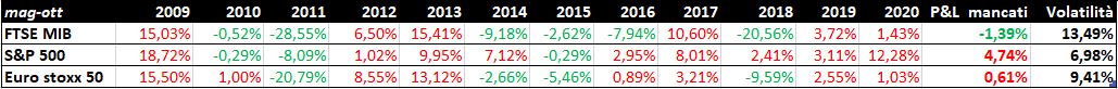 In questa tabella riportiamo i risultati per il FTSE MIB, l’S&P 500 e l’Euro Stoxx 50.