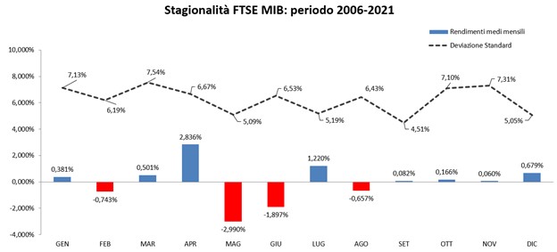 Come si osserva dal grafico, l’indice azionario italiano ha fatto registrare rendimenti medi tendenzialmente in discesa durante la stagione estiva e autunnale per poi manifestare recuperi a partire dai mesi invernali fino al picco dei ritorni in aprile.