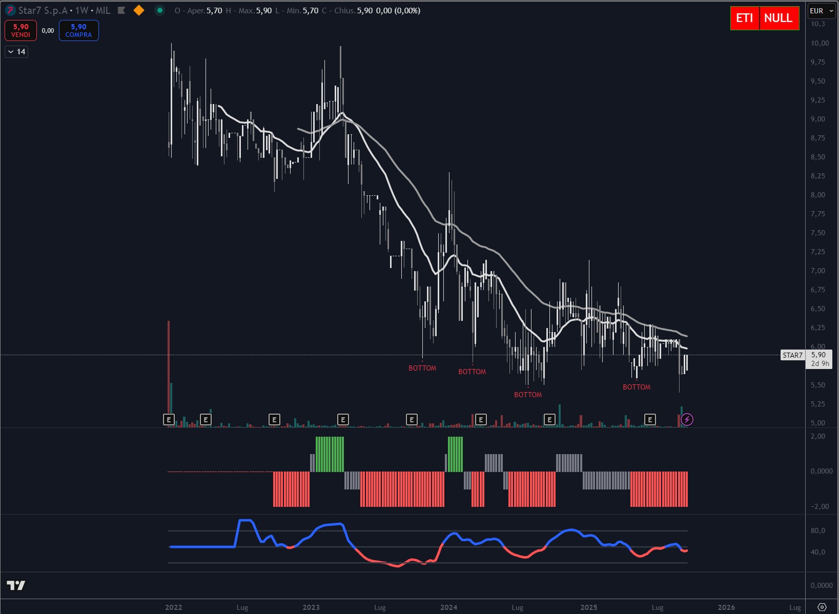 Il grafico di Star7 mette in evidenza una fase di debolezza prolungata: dai massimi segnati nel 2022 il titolo è sceso costantemente, con più tentativi di rimbalzo falliti. Negli ultimi mesi si è formato un supporto nell’area dei minimi storici, con diversi pattern di bottom che indicano tentativi di stabilizzazione, senza però un’inversione convincente.
