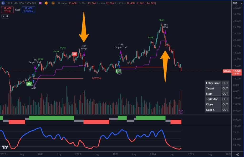 Nell’immagine abbiamo messo in evidenza in giallo le due più recenti uscite del sistema Trendycator sul titolo Stellantis NL00150001Q9.