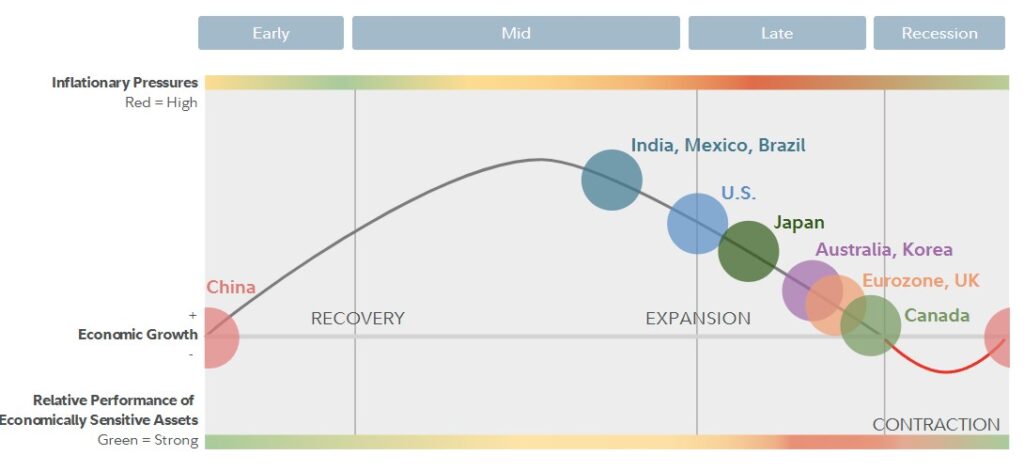 Interessante questa immagine tratta dal sito Fidelity che ci mostra come il ciclo economico (secondo Fidelity) in questo momento è nella fase discendente verso la recessione.