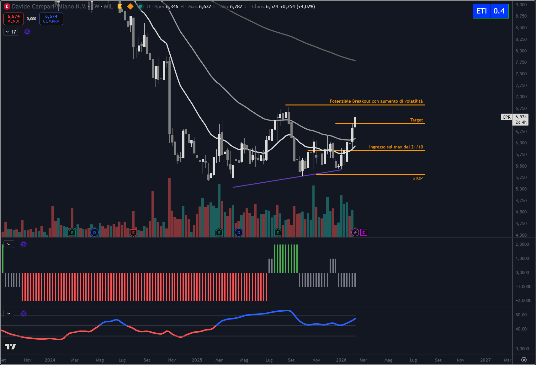L’ingresso era stato impostato sulla rottura del massimo del 21 ottobre, in un contesto di compressione dei prezzi e progressiva ripresa di volatilità. Il titolo ha successivamente sviluppato il movimento atteso, raggiungendo il target del +10%.