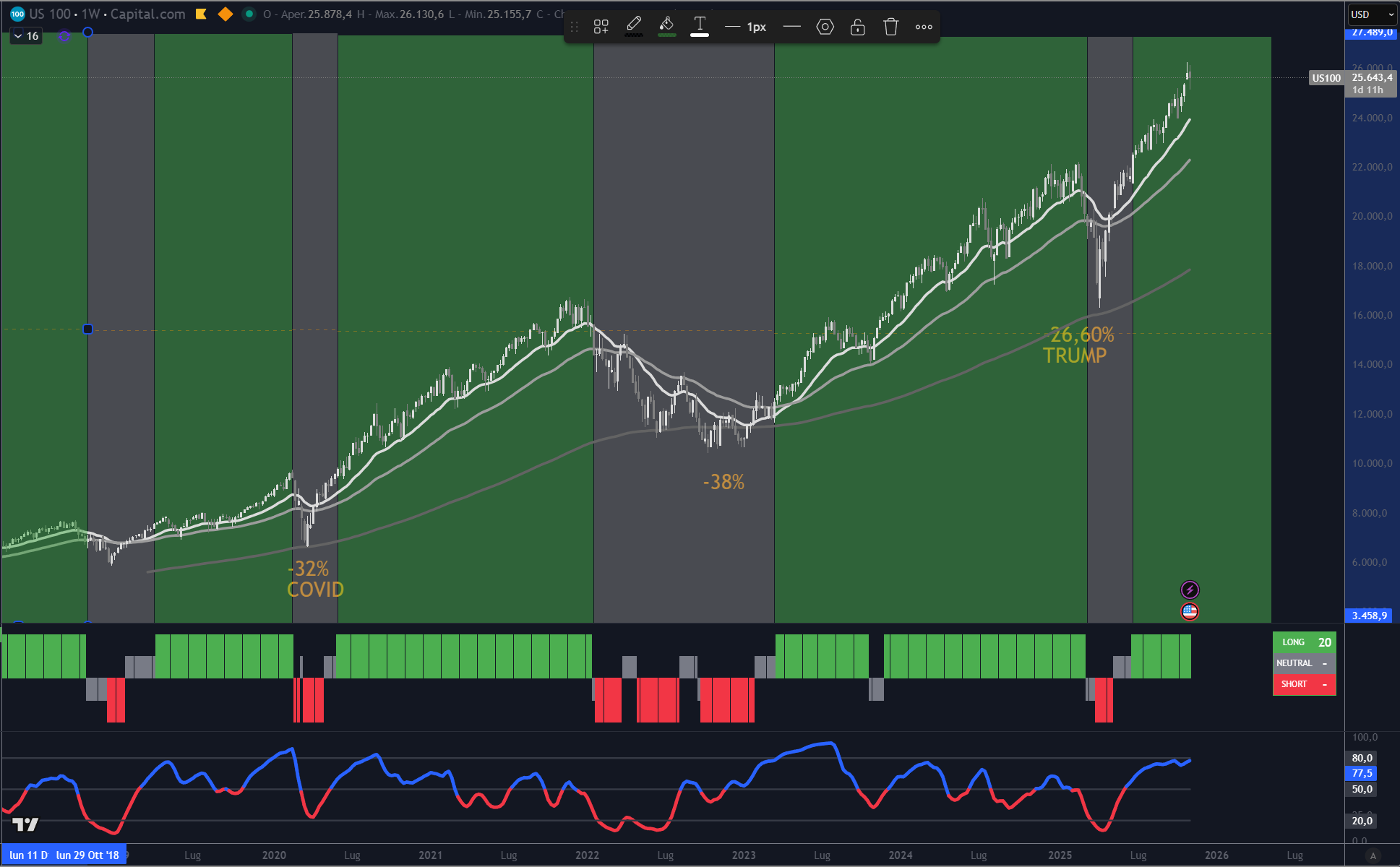Nell’immagine proposta si notano le zone di trend in verde isolate dalle zone di non trend in grigio/rosso. Nelle zone di non trend, seppure il mercato non abbia subito grandi crolli e sebbene con il senno di poi sarebbe stato meglio essere investiti, si potevano comunque allocare le risorse altrove, in modo più efficiente, soprattutto considerando che alcune zone grigie o rosse durano anche diversi mesi o anni.
