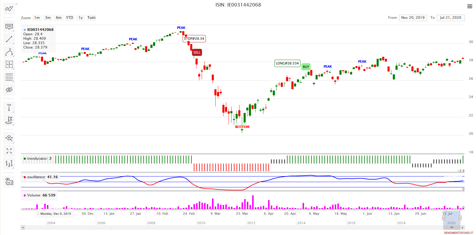 Osservando il grafico in Fig.1, che rappresenta l’ETF in parola su scala weekly, possiamo notare due cose: la prima riguarda i tempi di uscita dal mercato allo scoppio dell’emergenza COVID; la seconda riguarda invece la dinamica di recupero del mercato in rapporto al Trendycator. Sotto il profilo del tempismo del modello nell’indicare l’uscita non vi è molto da dire, posto che l’integrazione tra weekly e daily mostra, ovviamente, un leggero anticipo del daily che ha sancito il SELL il 27 febbraio contro il 6 marzo del weekly.