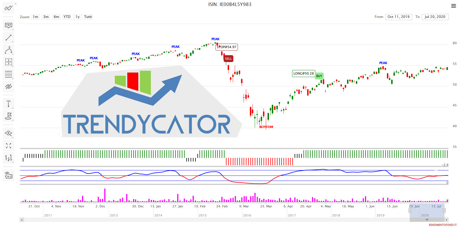 Osservando il grafico in Fig.1, che rappresenta l’ETF in parola su scala weekly, possiamo notare due cose: la prima riguarda i tempi di uscita dal mercato allo scoppio dell’emergenza COVID; la seconda riguarda invece la dinamica di recupero del mercato in rapporto al Trendycator. Sotto il profilo del tempismo del modello nell’indicare l’uscita non vi è molto da dire, posto che l’integrazione tra weekly e daily mostra, ovviamente, un leggero anticipo del daily che ha sancito il SELL il 27 febbraio contro il 6 marzo del weekly.