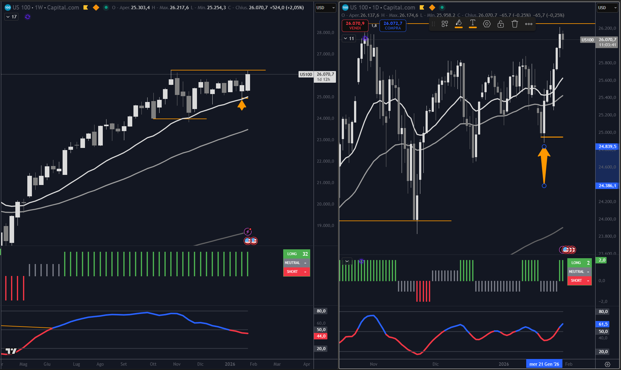 Durante l’ultimo Mastermind del 22 gennaio, l’analisi condotta con i partecipanti al Circolo Pro aveva evidenziato la falsa rottura, segnalata dalla freccia gialla sul grafico daily, come configurazione compatibile con un ritorno dell’indice in area massimi.