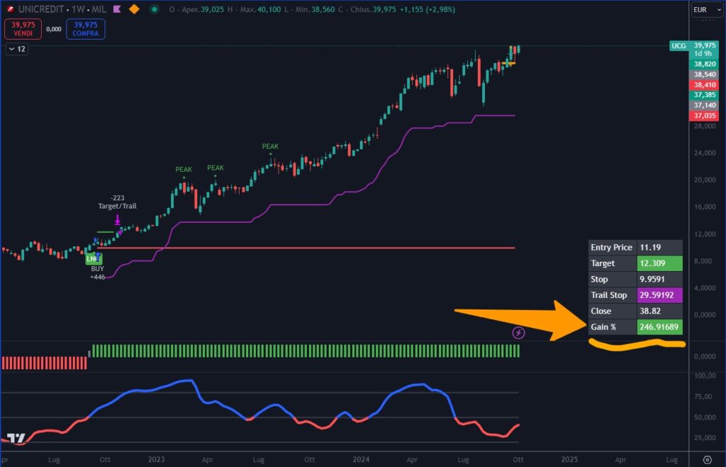 Il titolo Unicredit IT0005239360 ha registrato una performance eccezionale nel 2024, portando a un guadagno del +250% grazie all’efficacia dei segnali del nostro indicatore proprietario, Trendycator. Nel grafico sottostante, si può osservare come il Trendycator abbia identificato chiaramente i punti di ingresso ottimali, permettendo agli investitori di capitalizzare questa straordinaria crescita.
