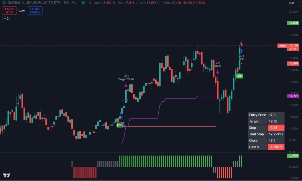 Recentemente, il Trendycator ha segnalato una posizione long su questo ETF, dopo aver chiuso con successo una precedente operazione. Al momento, il prezzo di questo ETF si trova vicino ai massimi annuali, segnalando un forte momentum rialzista in linea con l’aumento del prezzo dell’uranio e la rinnovata fiducia nell’energia nucleare.