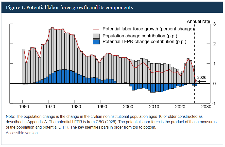 Il passaggio centrale è la frenata dell’offerta di lavoro. Il rallentamento dell’immigrazione e l’invecchiamento della popolazione hanno contribuito a portare la crescita della forza lavoro su livelli molto bassi. Secondo le stime richiamate dalla Fed, nel 2026 la crescita potenziale potrebbe essere quasi piatta.