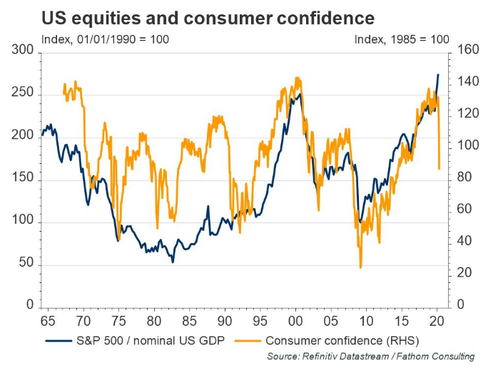 Questo grafico che vi propongo oggi va a confermare ancora una volta la tesi che il rialzo degli indici americani non è supportato dalla fiducia delle persone, è dunque un rialzo effimero. Il principale motore del rally dei mercati azionari globali in questo periodo è dato dalla massiccia iniezione di liquidità da parte della Fed, della BCE e delle altre principali banche centrali, piuttosto che un miglioramento sostanziale delle prospettive economiche.