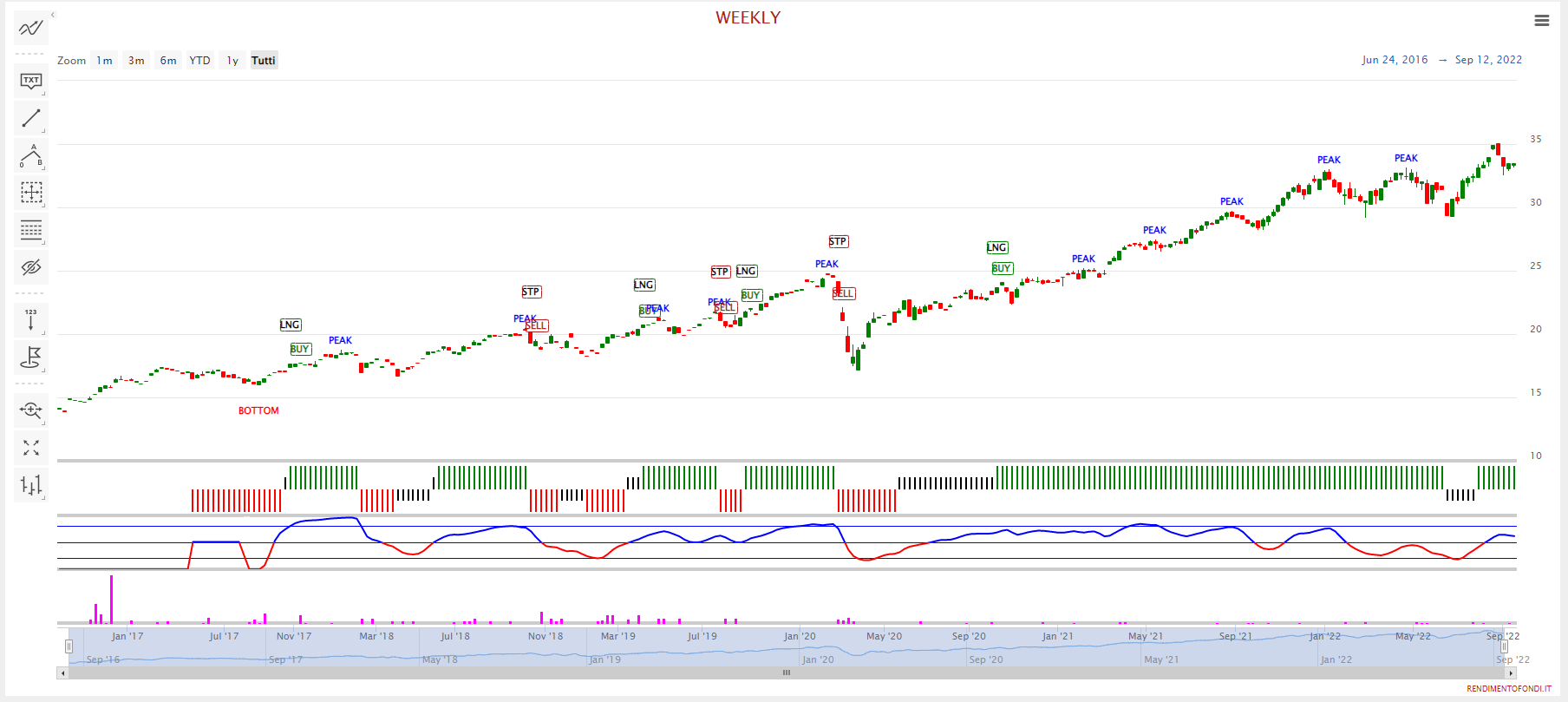 Come visibile dall’immagine seguente, fin dal suo esordio l’ETF ha ben performato, crescendo con una certa costanza. Questo trend è infatti confermato anche dal valore ETI, che si attesta sul 26. Inoltre, l’ultimo segnale BUY è arrivato a ottobre 2020 e da allora il Trendycator è in posizione da ben 100 settimane consecutive.